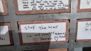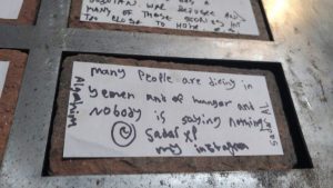 According to the Geopolitics Alert, the exhibit took place in Hamtramck, Michigan last week called The Wall Speaks – Voices of the Unheard. The aim of the exhibit was to give a voice to the forgotten victims of various wars– and it doesn’t get much more forgotten than Yemen.