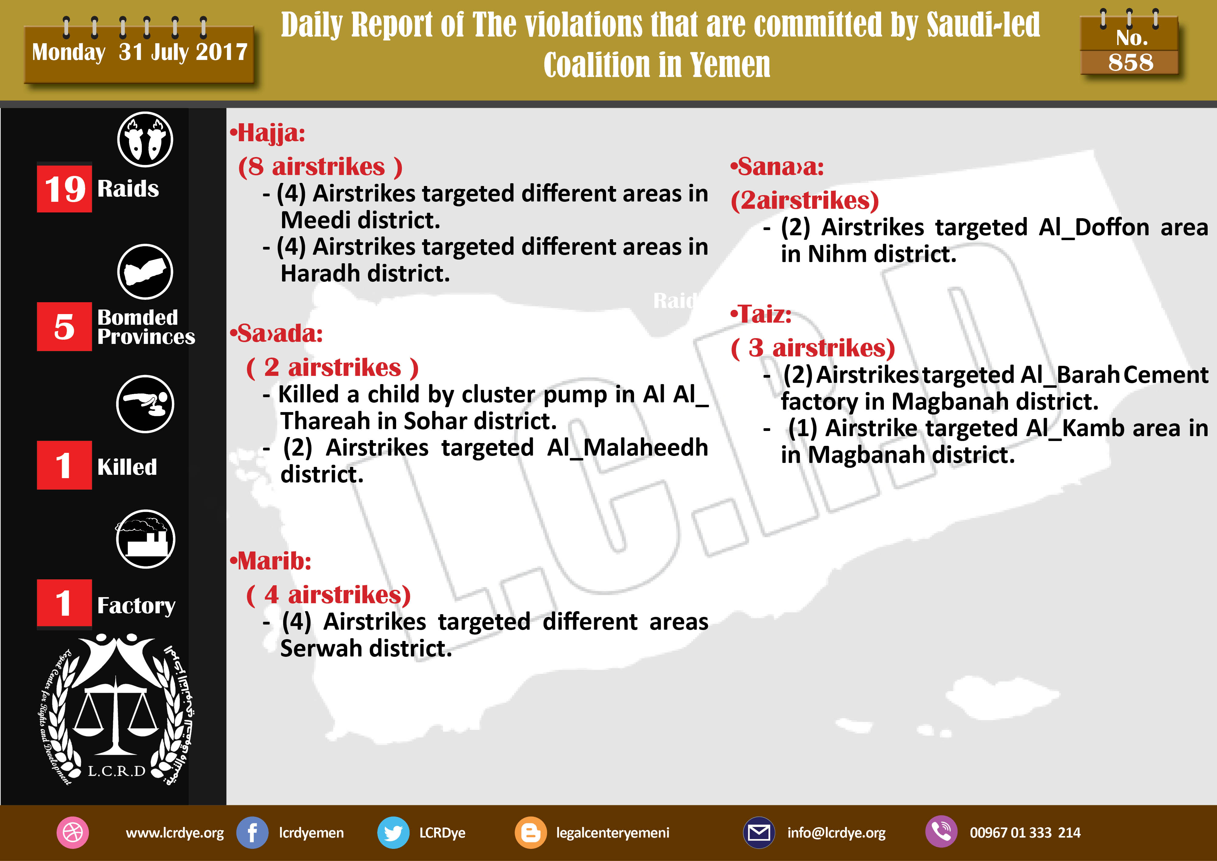 Saudi raids and crimes in July 31,2017 Last updated Aug 2, 2017 Share YemenExtra Continue Reading Share FacebookTwitterGoogle+ReddItWhatsAppPinterestEmailLinkedinTumblrTelegramPrint