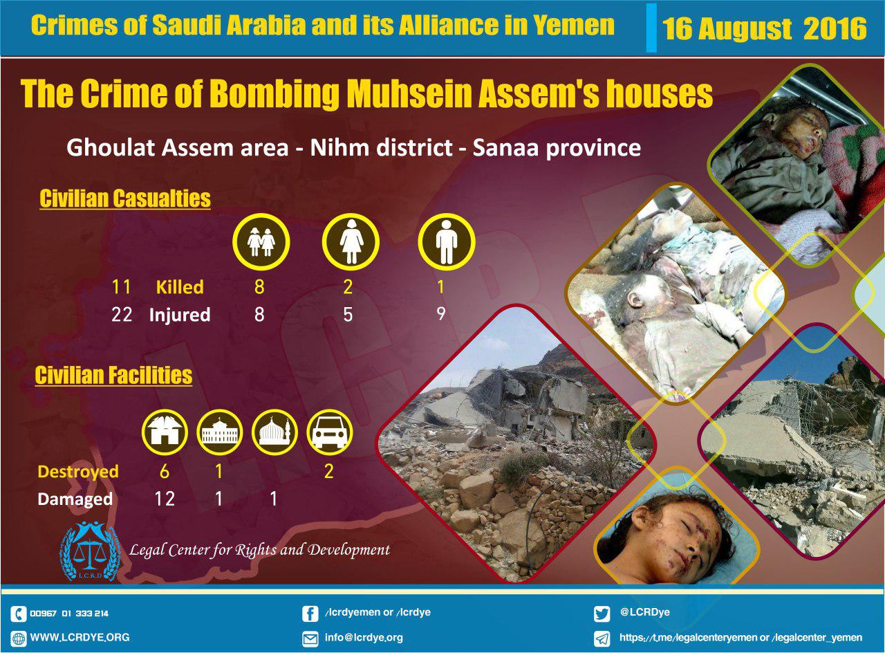 The Crime of Bombing Mohsein Assam`s House at Nihm District,Sana`a Province in August 16,2017 Last updated Aug 22, 2017 Share Continue Reading Share FacebookTwitterGoogle+ReddItWhatsAppPinterestEmailLinkedinTumblrTelegramPrint