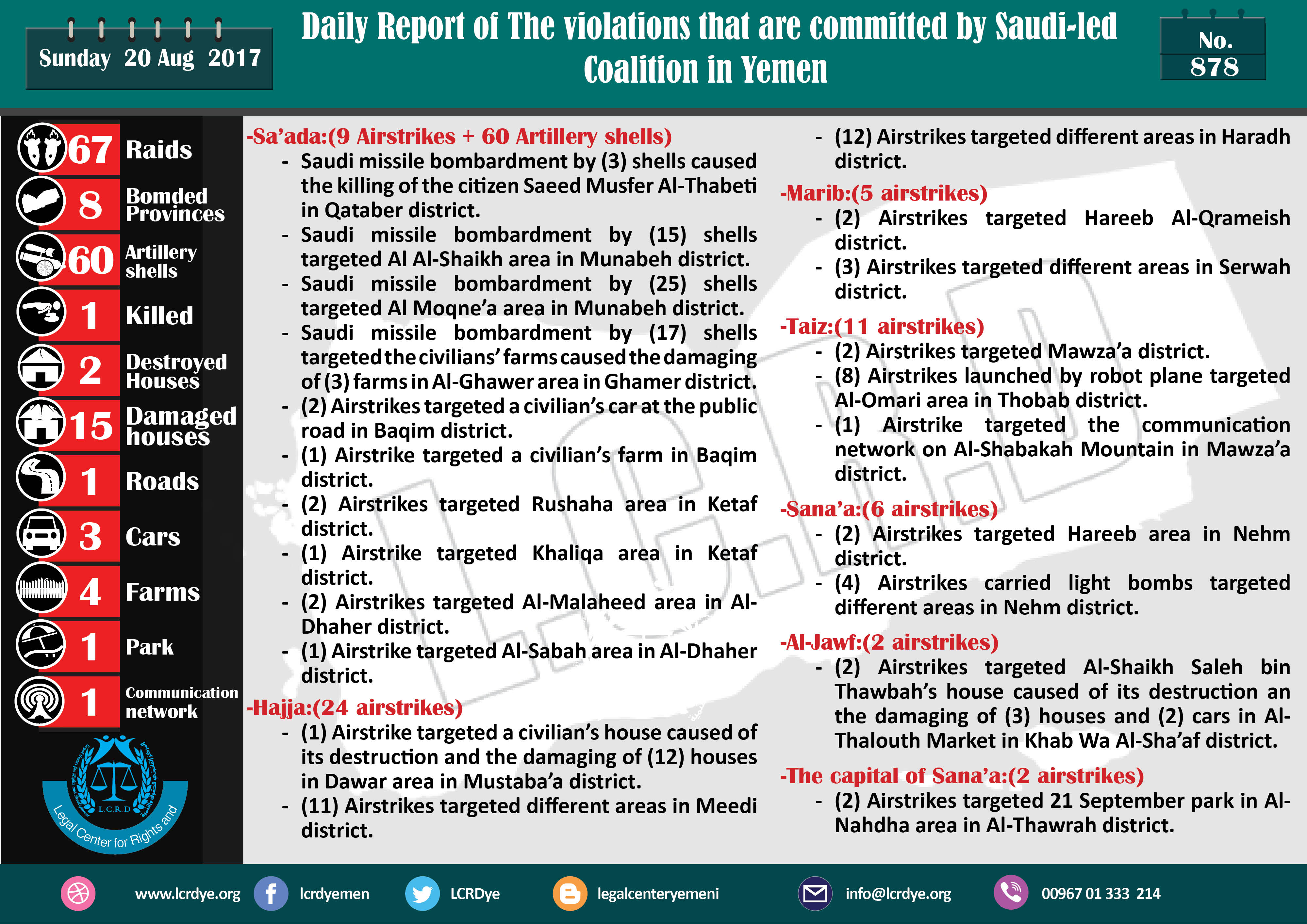 Saudi air strikes and crimes in August 20,2017 Last updated Aug 24, 2017 Share Continue Reading Share FacebookTwitterGoogle+ReddItWhatsAppPinterestEmailLinkedinTumblrTelegramPrint