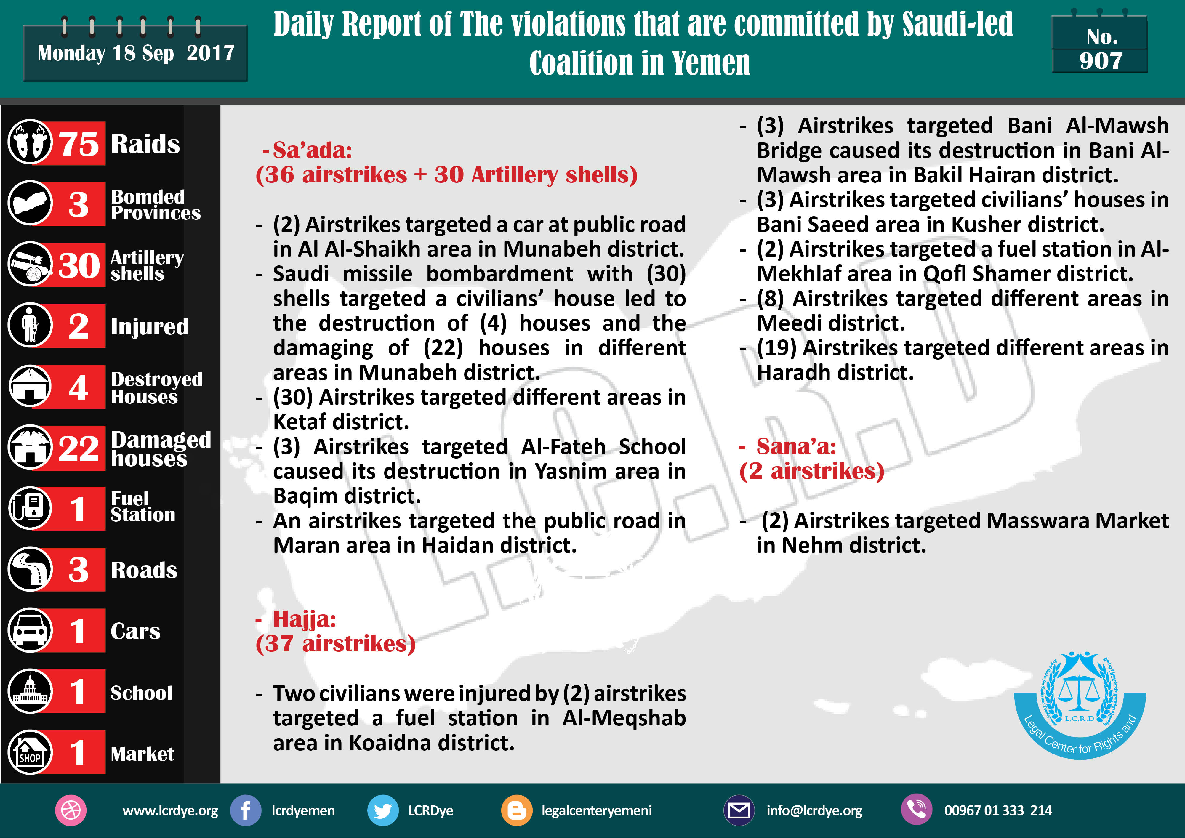 Saudi Crimes and Raids in September ,2017 Last updated Sep 27, 2017 Share YemenExtra Continue Reading Share FacebookTwitterGoogle+ReddItWhatsAppPinterestEmailLinkedinTumblrTelegramPrint