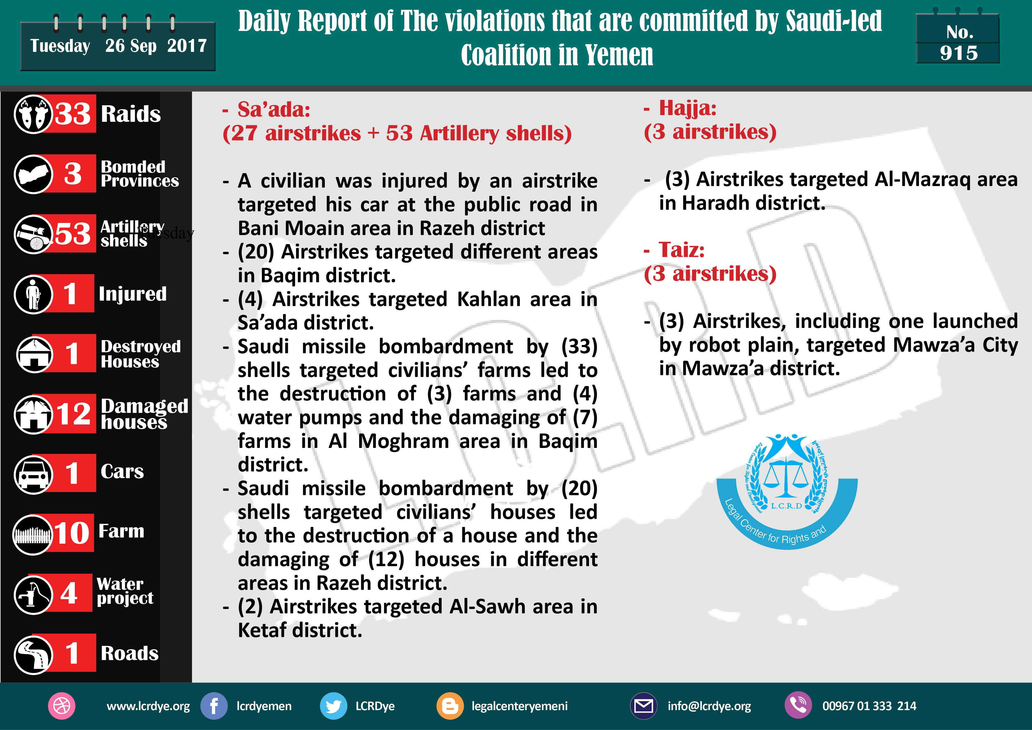 Saudi crimes and raids in September 26,2017 Last updated Sep 28, 2017 Share Continue Reading Share FacebookTwitterGoogle+ReddItWhatsAppPinterestEmailLinkedinTumblrTelegramPrint