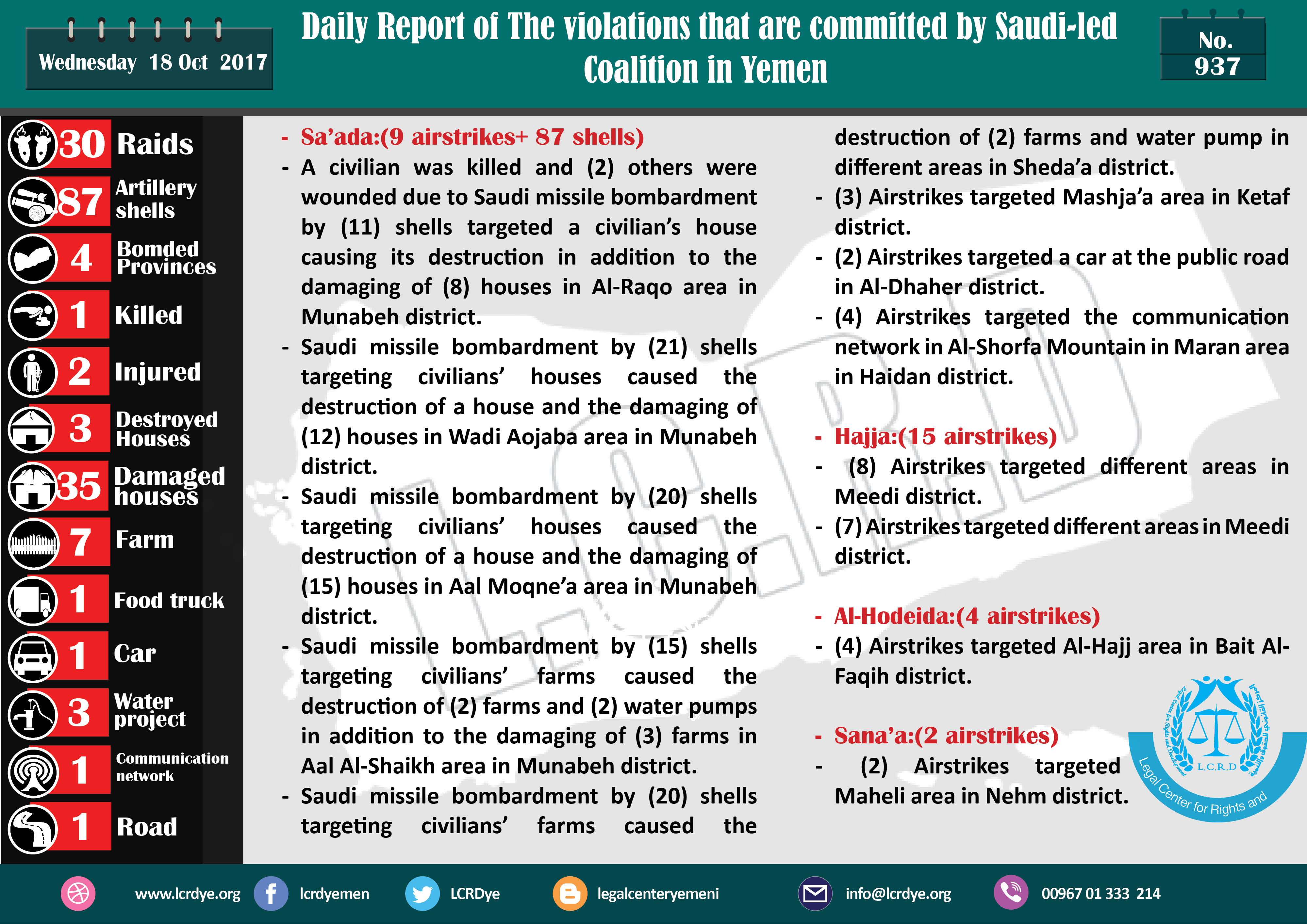 Saudi Raids and Crimes in October 18,2017 Last updated Oct 22, 2017 Share Continue Reading Share FacebookTwitterGoogle+ReddItWhatsAppPinterestEmailLinkedinTumblrTelegramPrint