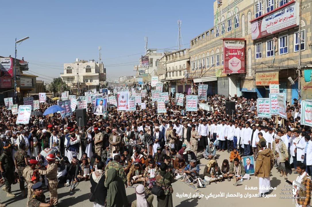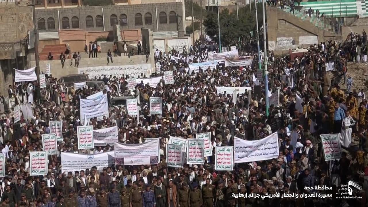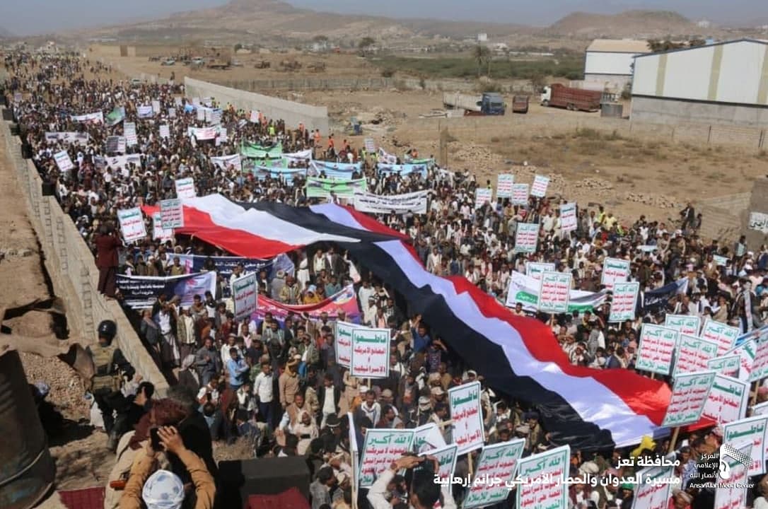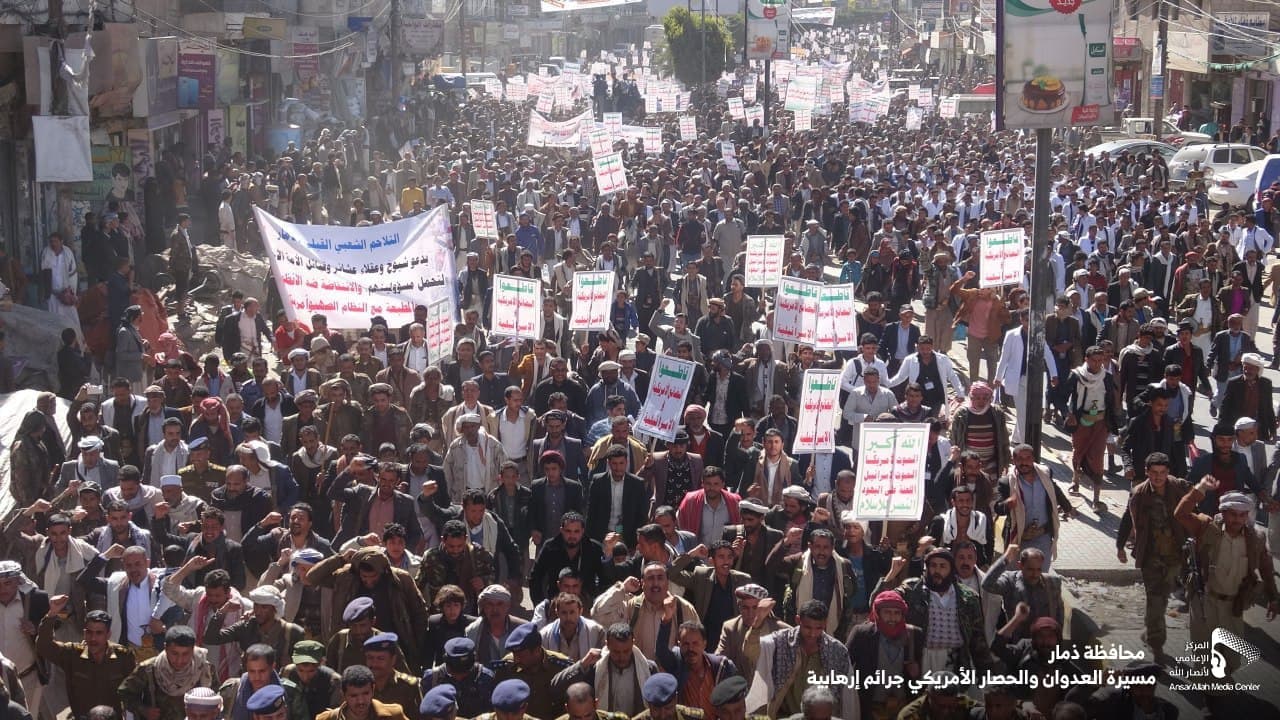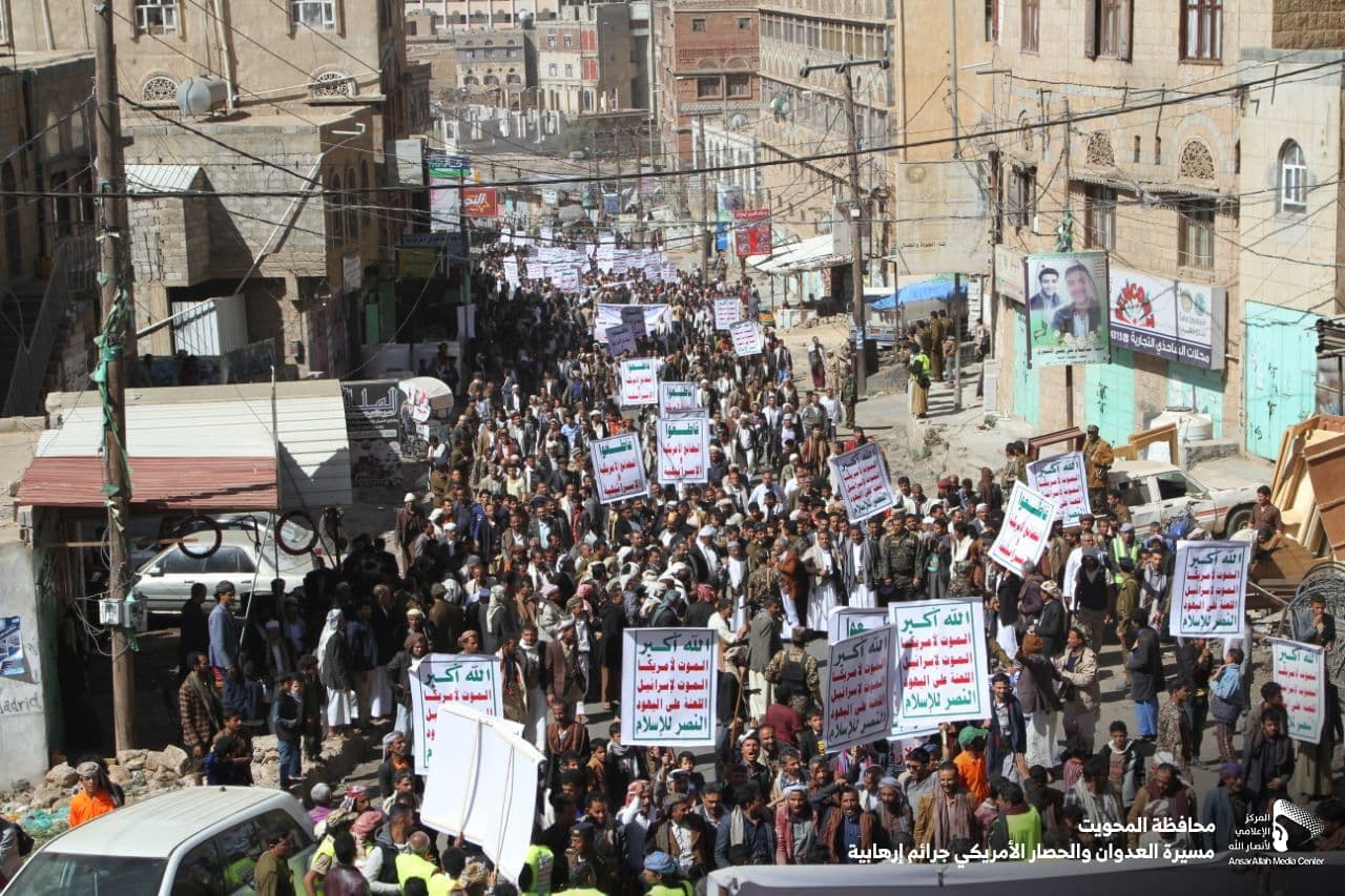 Hundreds of thousands of Yemenis demonstrated today, Monday morning, in a number of 20 massive rallies within 12 governorates, to condemn the crimes and terrorism conducted by the US against the Yemeni people. These rallies named their protests “The blockade and American aggression are terrorist crimes.”