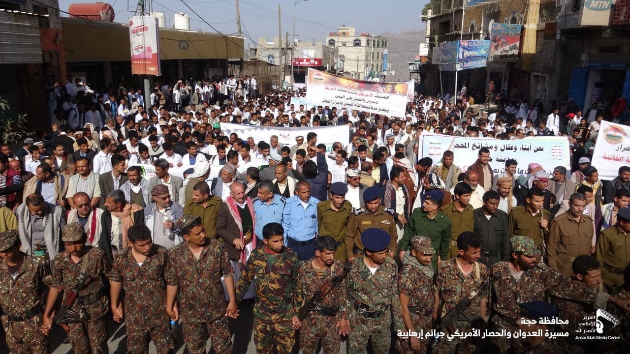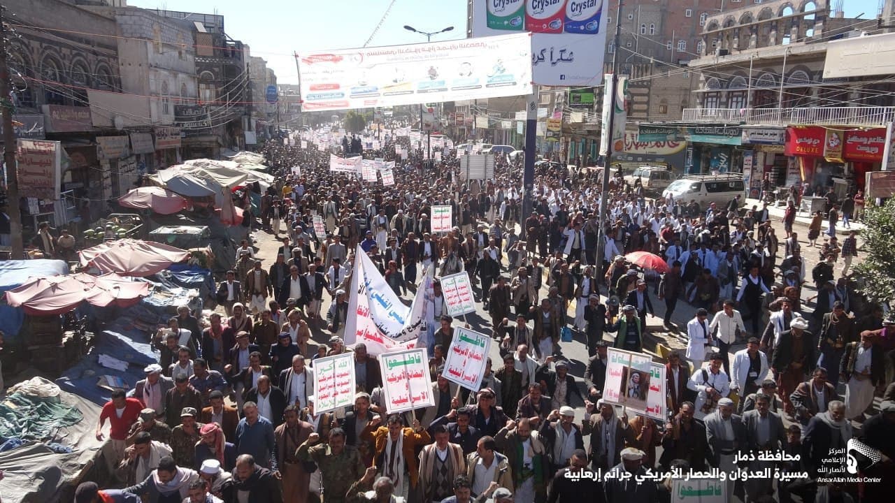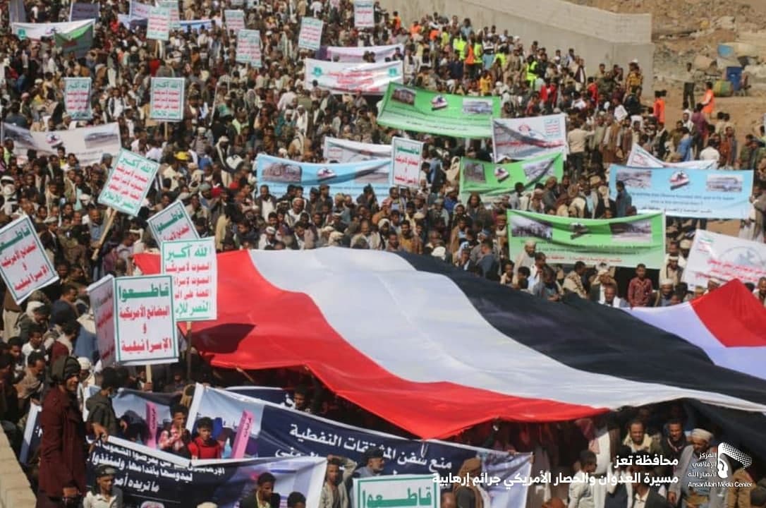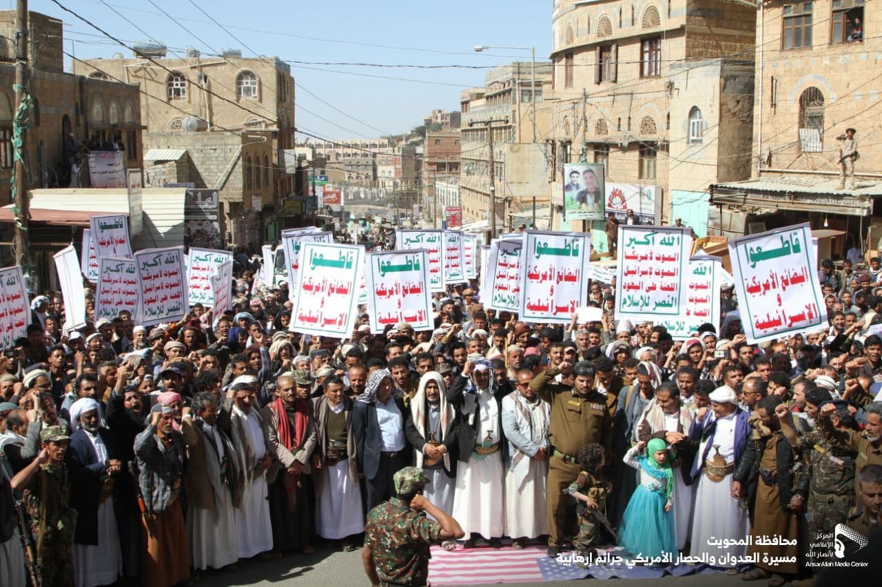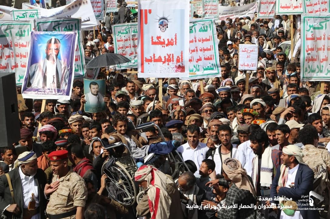 Hundreds of thousands of Yemenis demonstrated today, Monday morning, in a number of 20 massive rallies within 12 governorates, to condemn the crimes and terrorism conducted by the US against the Yemeni people. These rallies named their protests “The blockade and American aggression are terrorist crimes.”