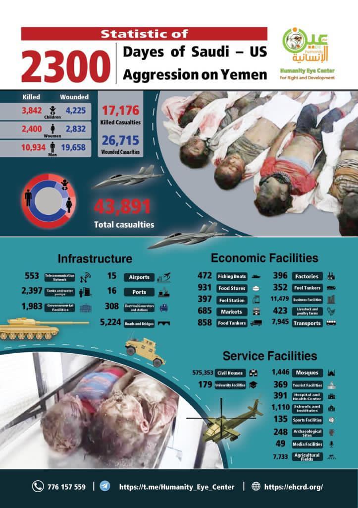 Today, Sunday, Humanity Eye Center for Rights and Development revealed statistics on the crimes of the US-supported Saudi-led coalition within 2,300 days of aggression on Yemen.