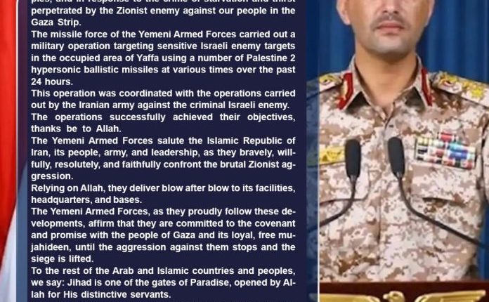 The missile force of the Yemeni Armed Forces carried out a military operation targeting sensitive Israeli enemy targets in the occupied area of Yaffa using a number of Palestine 2 hypersonic ballistic missiles at various times over the past 24 hours.