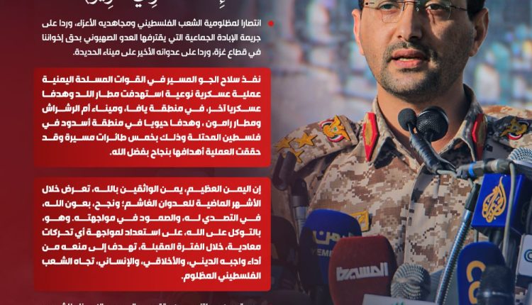 “We remain steadfast and committed to providing support and backing to the oppressed Palestinian people… and our operations will not stop except with an end to the aggression against Gaza and the lifting of the siege,” the Armed Forces concluded, renewing their pledge that Yemen will neither be silent nor retreat until the aggression is broken and the suffering of our people in Gaza and Palestine is lifted.