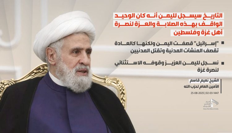 Hezbollah Secretary-General Sheikh Naim Qassem renewed his high praise for Yemen’s genuine stance in supporting Gaza, describing it as an “exceptional, heroic and rare” position that will be recorded in the pages of history in glowing letters — the truest Arab and Islamic position at a time of hesitation and submission.