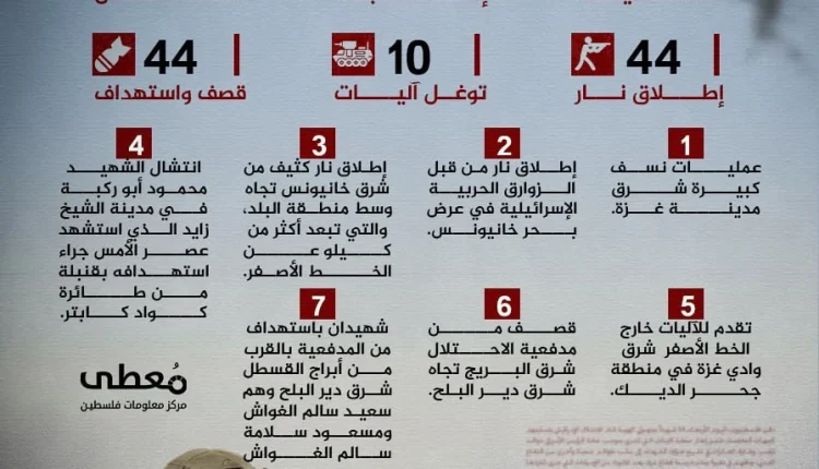The Israeli enemy carried out 44 shooting operations, 10 vehicle incursions beyond the Yellow Line, in addition to 44 shelling and targeting operations in various areas of the Strip.